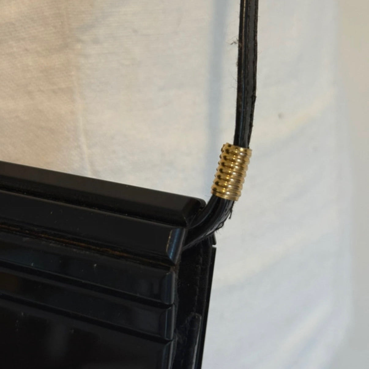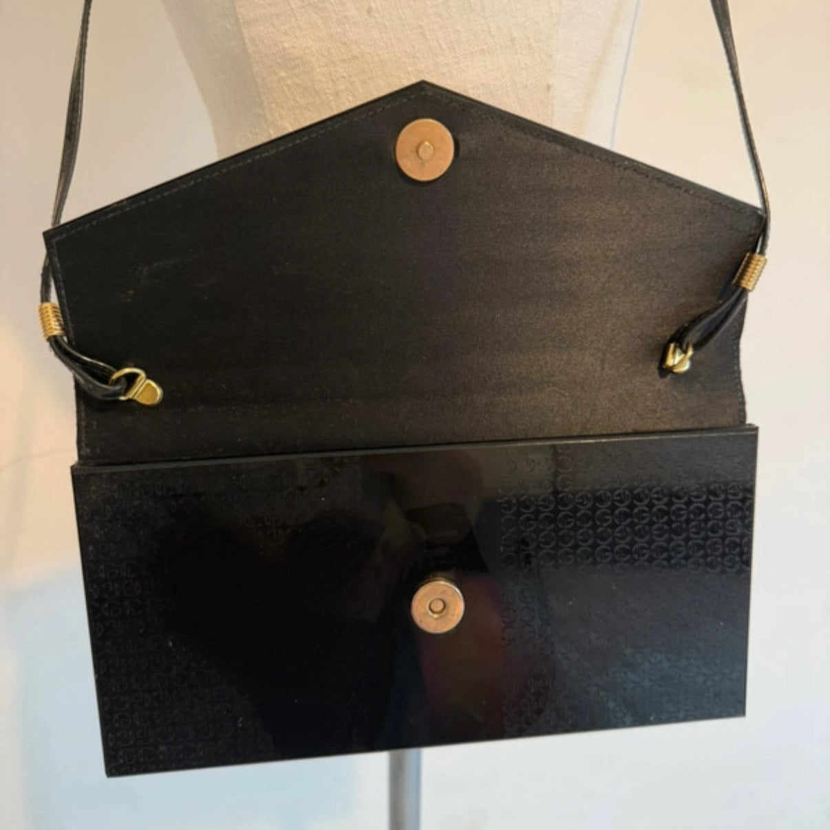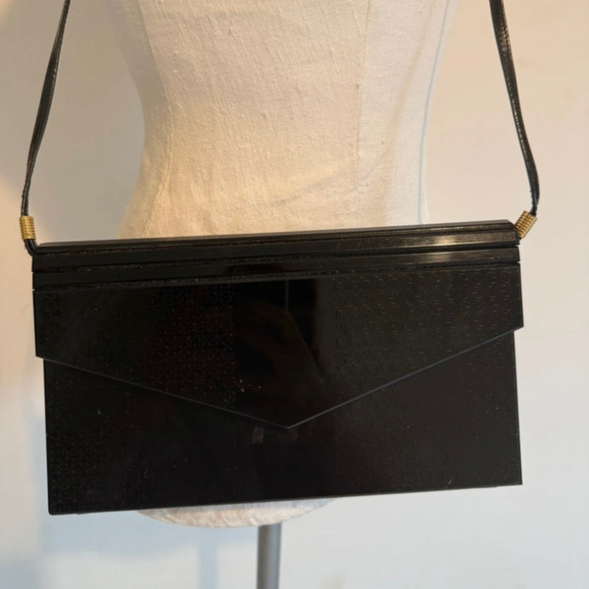 Borsetta da sera anni Ottanta in plastica di colore nero con dettagli dorati lungo i manici. Chiusura con bottone a pressione. Da portare a spalla (manico non regolabile).