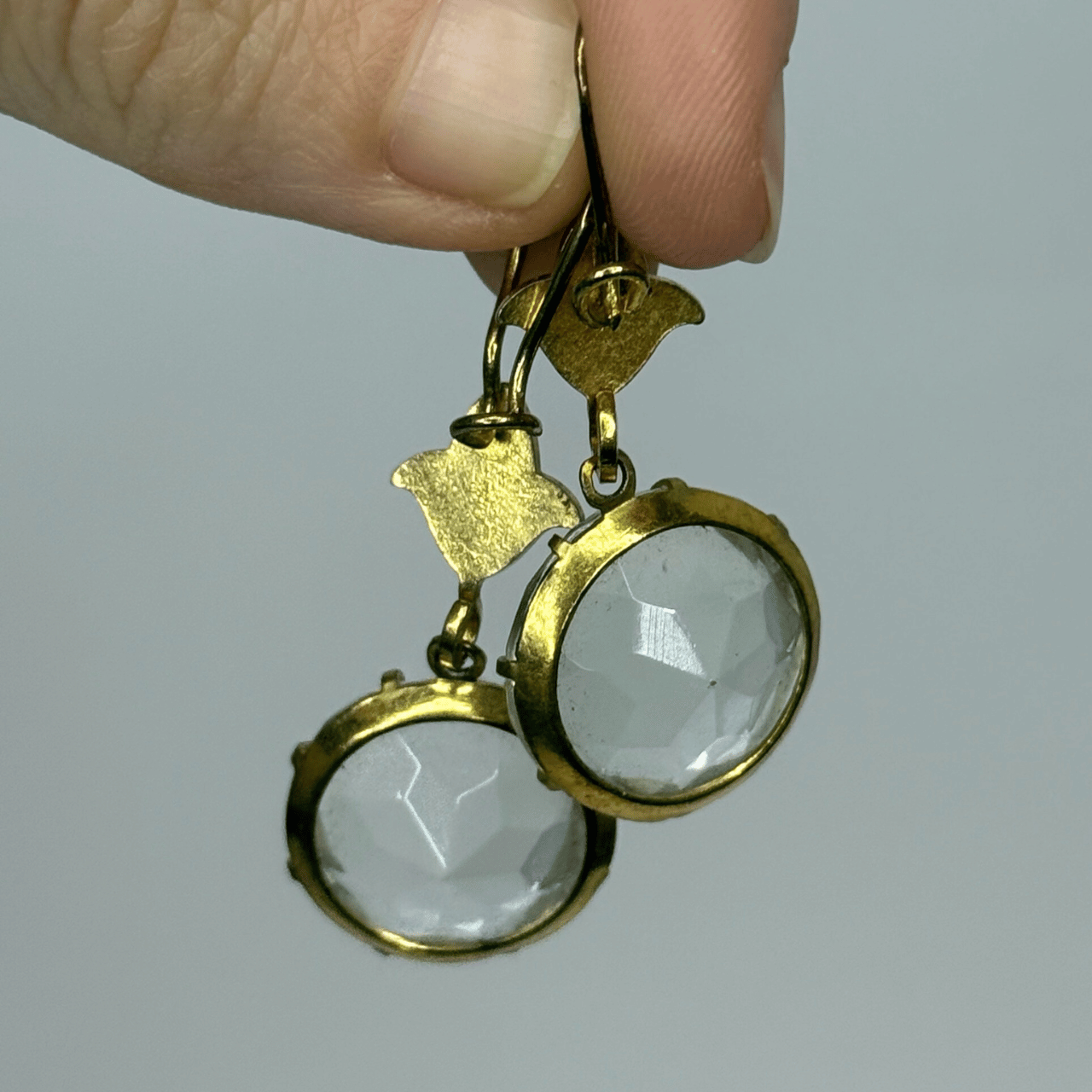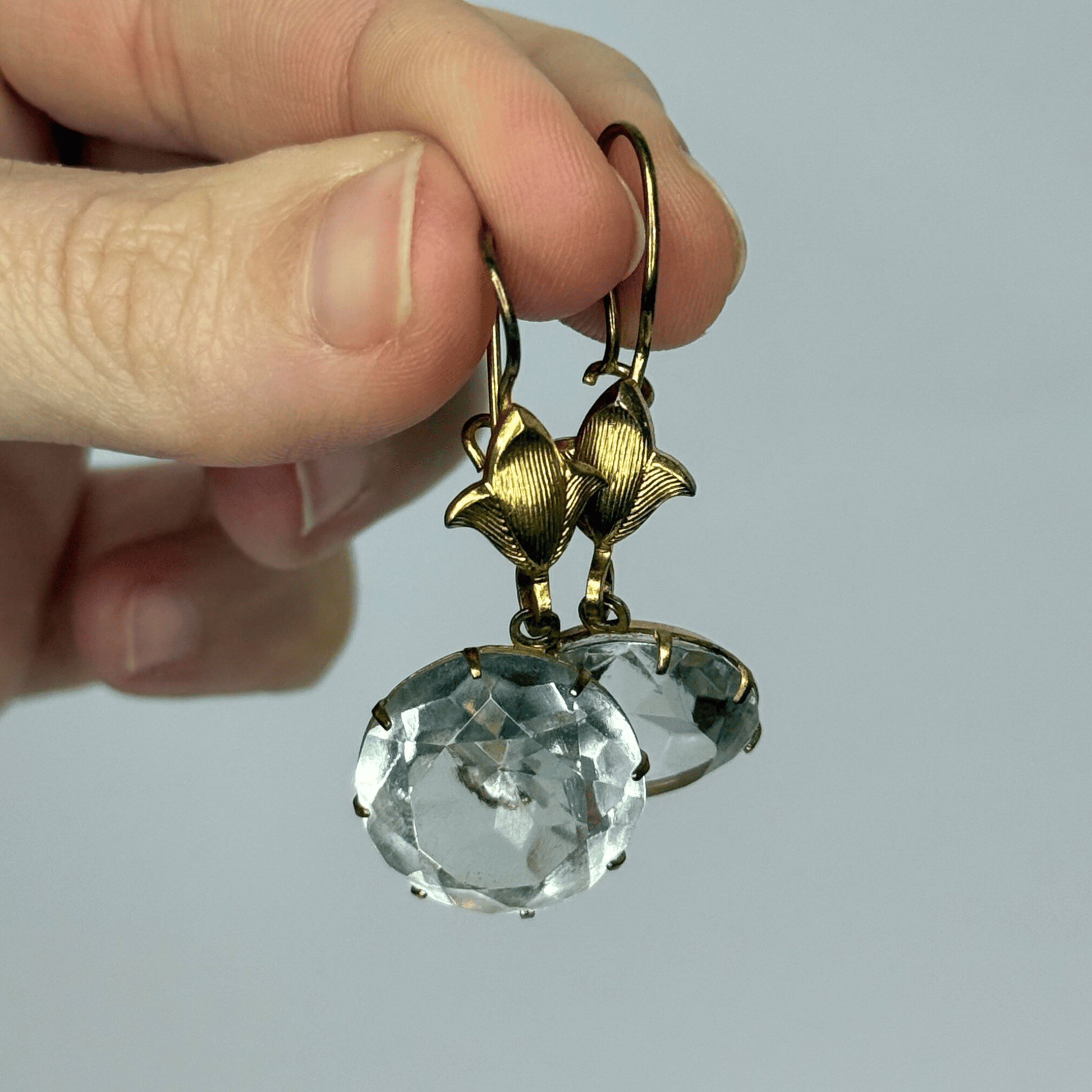 Vintage orecchini pendenti placcati oro con una pietra ovale sfaccettata simil cristallo. Dettaglio barocco placcato oro e chiusura a gancio. Stile classico ed elegante di eccellente qualità anni Sessanta.